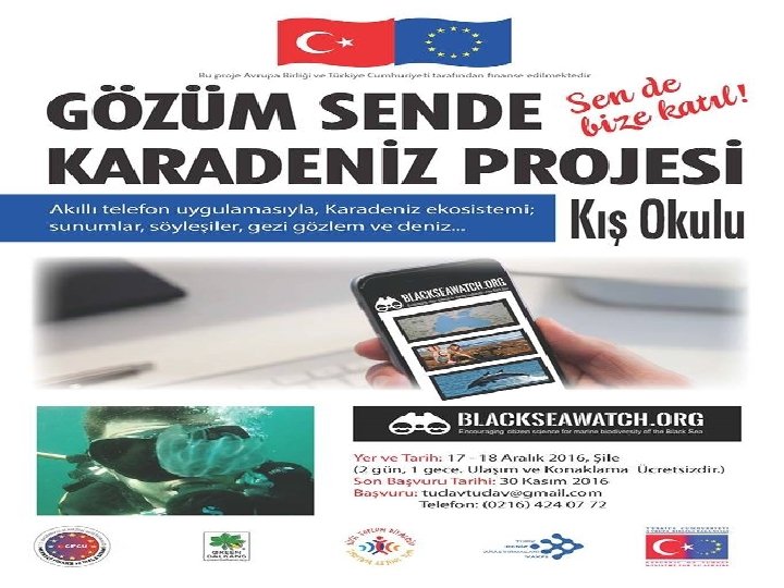 TÜDAV GÖZÜM SENDE KARADENİZ Akıllı telefonlarda kullanılmak üzere hazırlanacak uygulama ve internet sitesi için metin, harita ve fotoğraf gibi bilgilerin toplanması, toplanan bilgilerin farklı ülkelerden uzmanlar ile birlikte değerlendirilmesi için düzenlenen çalıştaylar düzenlenmesi, akıllı telefonlar için uygulama ve internet sitesi tasarımı, geliştirilen araçların reklamının yapılması, Karadeniz biyoçeşitliliği konusunda eğitim amaçlı broşürlerin ve proje sonuçları ile geliştirilmiş araçların geniş kitleler tarafından kullanımını test eden el ilanlarının basılması bu projenin ana aktivitelerindendir. Proje boyunca geliştirilecek olan araçlar, yetişkinler için düzenlenen “bilim kafeleri” gençler ve öğrenciler için düzenlenen yaz okullarında çeşitli etkinliklerle halka tanıtılacaktır. Proje toplam süresi 12 aydır. www. blackseawatch. org