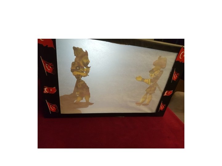 Hacivat ve Karagöz Gölge Oyunu İçin Hazırlanan Materyal’in Özelliği • Tasarım: Malzemeler: Boş koli, yağlı kâğıt, Hacivat. Karagöz oyunu kahramanlarının renkli çıktıları, yağlı kâğıt, çöp şiş veya uzun pipet, siyah fon kartonu, renkli bayrak çıktıları, yapıştırıcı ve makas. Boş kolinin bir tarafı televizyon ekranı şeklinde kesildi, kesilen yere kolinin iç tarafından yağlı kâğıt yapıştırıldı. Kolinin etrafı güzel bir görüntü oluşturması için siyah fon kartonu ile kaplandı ve sahne kısmına küçük bayrak çıktıları yapıştırıldı. Oyunun kahramanlarının bulunduğu kâğıtlar makasla kesildi ve kahramanların arkasından tutacak bir şekilde pipetle yapıştırıldı. Yağlı kâğıtta gölge çıkarmak için el feneri ışığı kullanıldı.