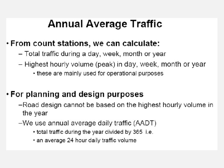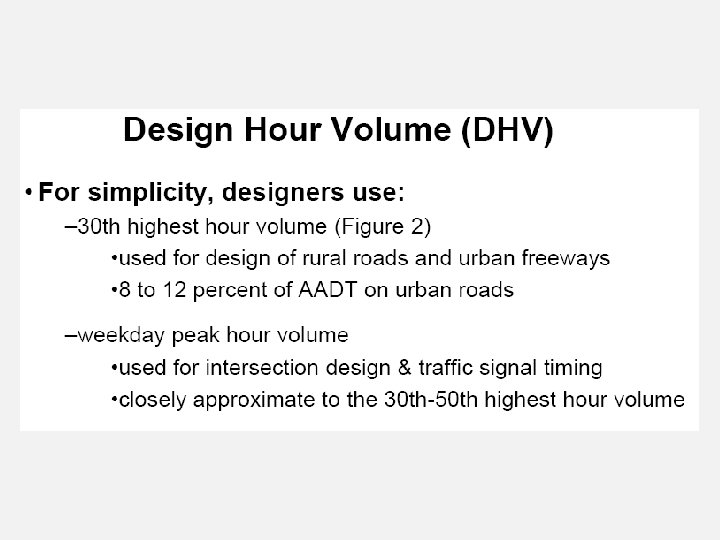 Untuk perancangan geometrik digunakan volume jam perancangan yang diperkirakan dari volume harian, dengan menggunakan persamaan: VJR = k x LHRT Perlu untuk mengkonversikan LHRT ke volume jam perancangan dengan menggunakan persamaan berikut: VJRA = D x k x LHRT dimana: VJR = volume jam perancangan LHRT= lintas harian rata-rata tahunan K = proporsi lalu lintas harian yang terjadi selama periode puncak, dinyatakan dalam nilai pecahan VJRA= volume jam perancangan per arah D = faktor distribusi arah