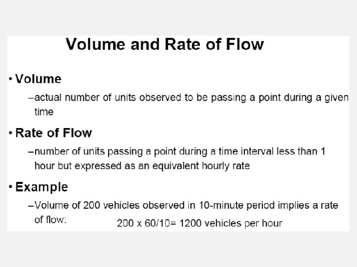 KARAKTERISTIK ARUS L. L. PARAMETER LALU LINTAS KUANTITAS PENGUKURAN Volume Jumlah kendaraan per satuan waktu Jumlah pejalan kaki atau sepeda per satuan waktu Kecepatan, Delay, dan Antrian Waktu, jarak, kecepatan (waktu/jarak), tundaan, panjang antrian Konsentrasi atau Kerapatan Kendaraan per satuan panjang