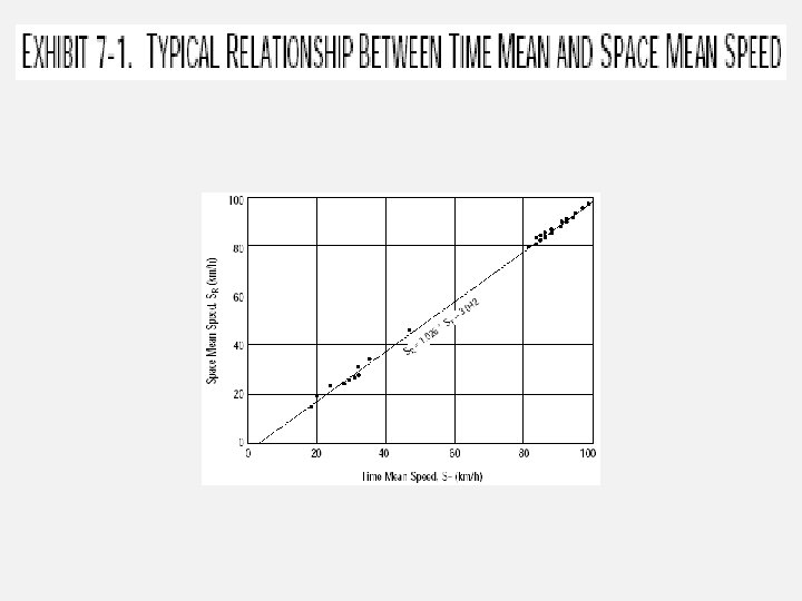 Kecepatan rata-rata dapat dihitung dengan menggunakan Persamaan berikut: Kecepatan rata-rata ini disebut sebagai kecepatan rata-rata waktu (time mean speed) karena masing-masing kecepatan diukur untuk kendaraan yang melintas suatu titik potongan jalan selama periode waktu tertentu. Jika kecepatan dikonversikan ke dalam waktu tempuh, kemudian dihitung waktu tempuh rata-rata dan akhirnya dihitung kecepatan rata-rata, maka kecepatan rata-rata menjadi kecepatan rata-rata ruang (space mean speed).