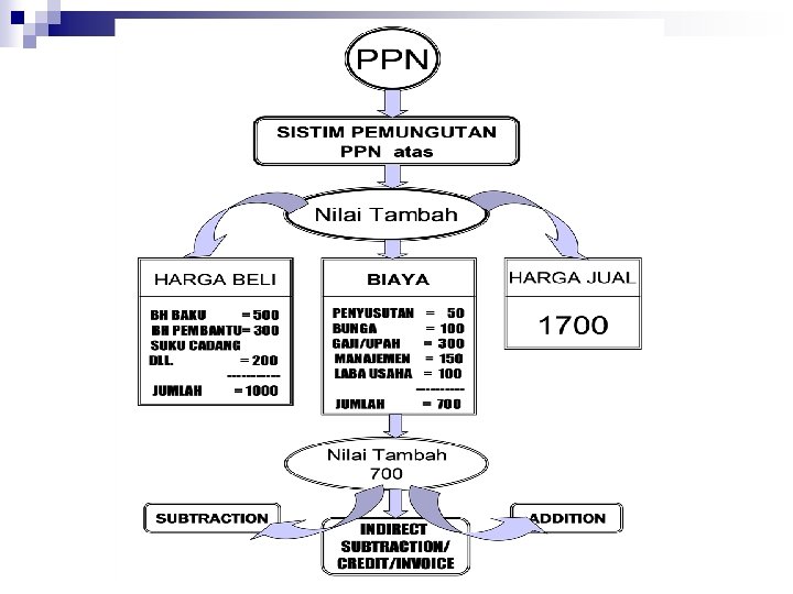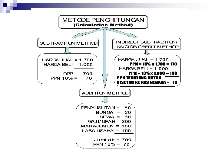 n Untuk menghitung PPN atas nilai tambah dapat dilakukan melalui tiga metode yaitu : Subtraction method (metode pengurangan secara langsung), yaitu dengan cara mengalikan tarif PPN dengan selisih antara harga jual dengan harga beli. ¨ Indirect subtraction method (metode pengurangan secara tidak langsung), yaitu dengan cara mengurangkan PPN yang dipungut oleh penjual atau pengusaha jasa atas penyerahan barang atau jasa, dengan PPN yang dibayar kepada penjual atau pengusaha jasa lain atas perolehan barang atau jasa. ¨ Addition method (metode penghitungan nilai tambah), yaitu mengalikan tarif PPN dengan hasil penjumlahan unsur nilai tambah. ¨