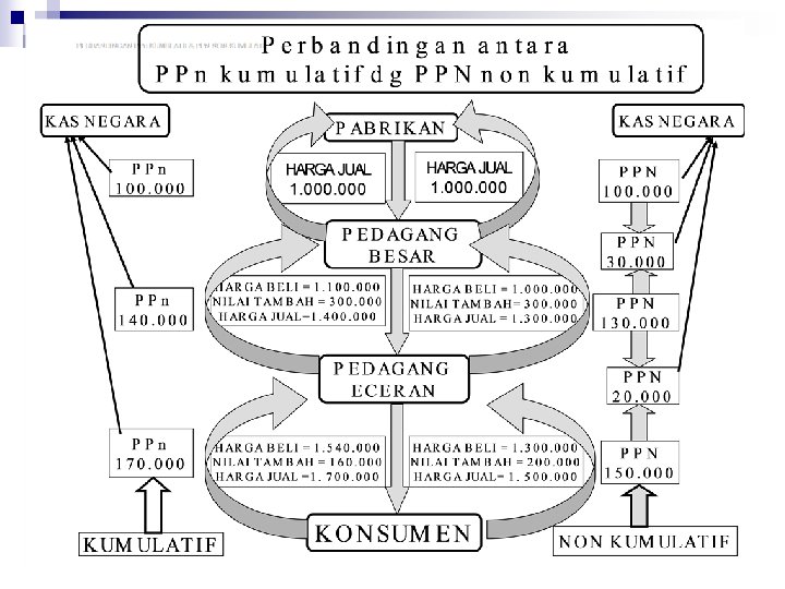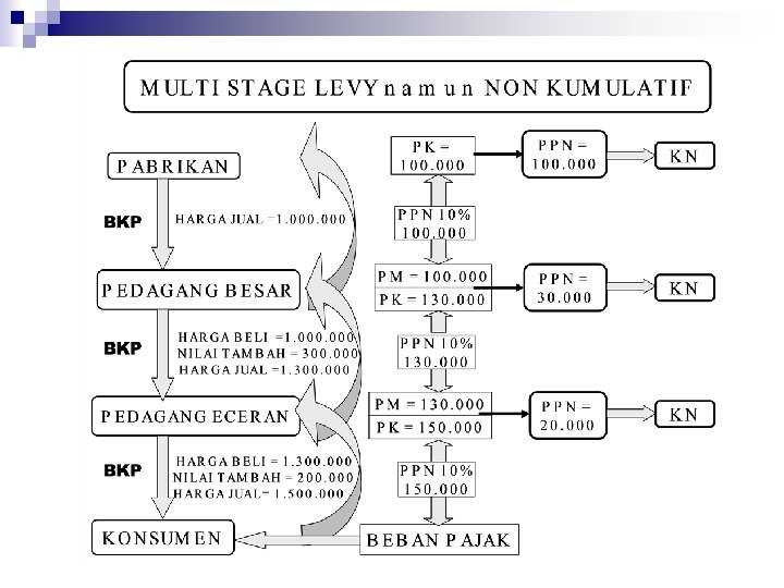 Multi Stage Levy namun Non Kumulatif n n Multi stage tax adalah karakteristik PPN yang mempunyai makna PPN dikenakan pada setiap mata rantai jalur produk si maupun jalur distribusi. Setiap penyerahan barang yang menjadi obyek PPN mulai dari tingkat pabrikan (manufacturer) kemudian ditingkat pedagang besar (wholesaler) dalam berbagai bentuk atau nama sampai dengan tingkat pedagang pengecer (retailer) dikenakan PPN.