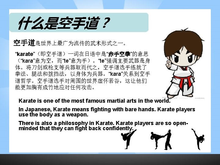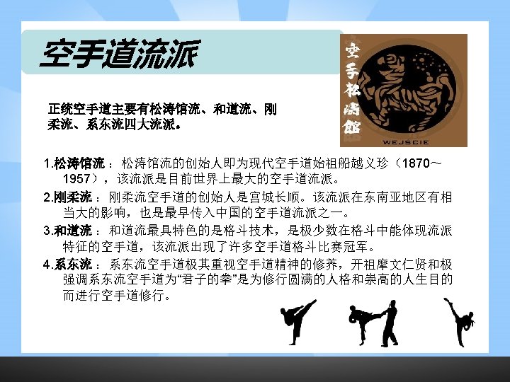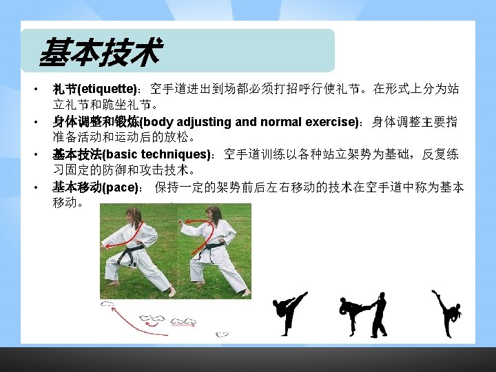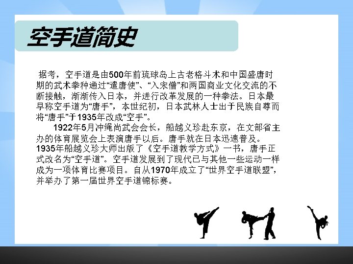 目录 Content 1 什么是空手道? What’s Karate? 2 空手道简史与流派 The history and schools 3 空手道等级与段位 The levels of Karate 4 空手道技术 The technology 5 空手道的积极意义 Positive effects