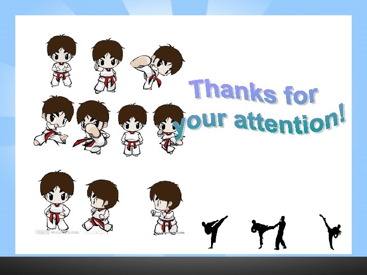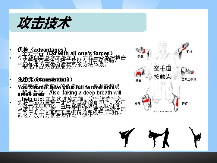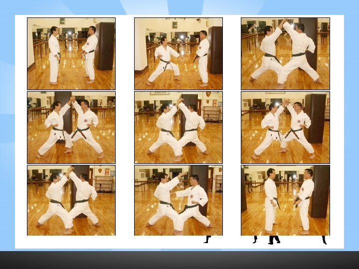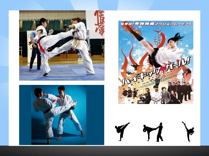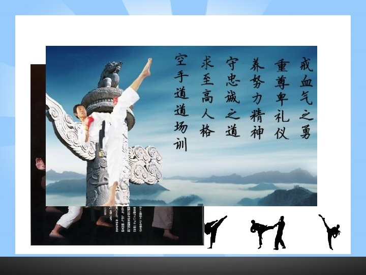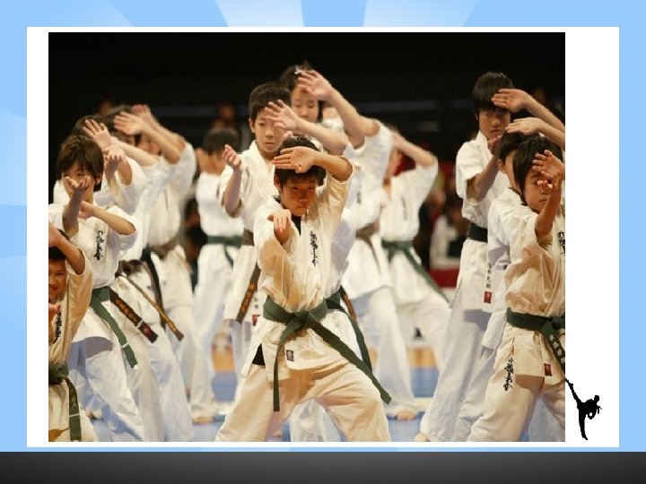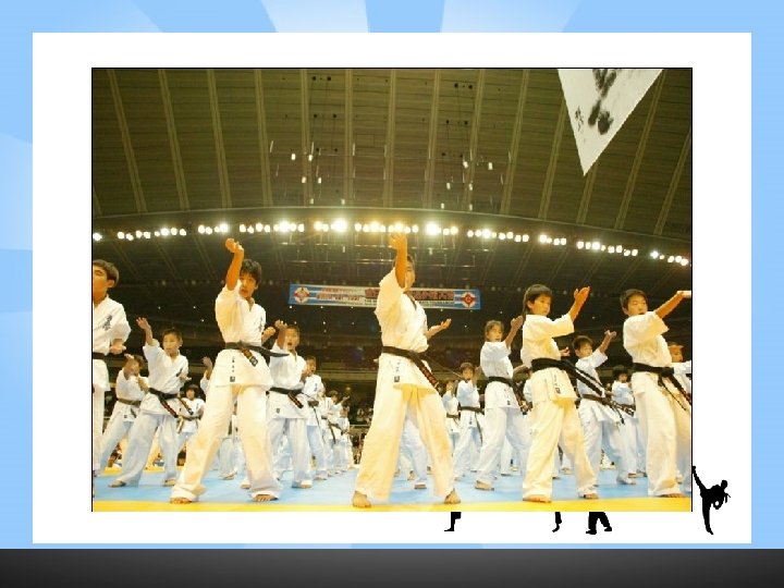 积极意义 空手道是世界推崇的全民健身体育。可以锻 炼人的外在肌体,可以让人具备内在自我控制 的意志及崇高的精神信念,具备果断、勇敢、 大度、博爱、自信、机智、冷静等个人优秀品 质,最重要的是它通过练习和认识能使一个人 充满非凡的气势,发挥人的巨大潜能,对当今 社会激烈的竞争无疑是大有帮助的。 Karate is a national fit-keeping program. It can not only exercise for physical health, but also build strong self-control and will power. Karate athletes are always decisive, brave, tolerant, confident, calm and intelligent. The most important thing is that Karate can bring your ability into full play and make you full of vigor. It’s helpful in the competitive society.