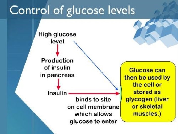 § Hormon insulin yang dihasilkan oleh pancreas berfungsi mengatur pemasukan glukosa ke dalam sel darah. § Jika konsentrasi glukosa sel tubuh rendah maka insulin akan mempertinggi permiabilitas dinding sel terhadap glukosa, sehingga glukosa darah masuk ke dalam sel tubuh, akibatnya glukosa darah turun konsentrasinya.