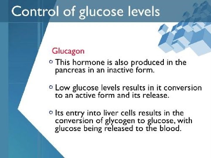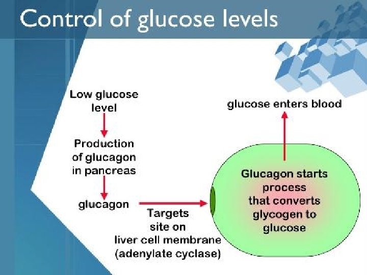 § Agar berlangsung keseimbangan antara kadar gula darah dalam darah dengan kadar gula dalam sel tubuh, maka growth hormone yang diproduksi oleh hypophisa merangsang pancreas untuk mensecresikan glukagon. § Glukagon merangsang glikogen menjadi glukosa darah. § Glukosa darah yang tinggi mengalir juga ke pancreas, dan akan disekresikan insulin demikian seterusnya