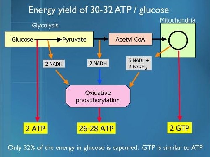 § Dalam setiap proses glikolisis dilepaskan 4 molekul ATP yang disimpan dalam mitochondria. ATP dengan katalisator mineral magnesium dipecah menjadi ADP + tenaga. § Dalam tubuh reaksi oksidasi harus sedemikian rupa sehingga jumlah kalori yang dilepaskan tidak menaikkan suhu media.
