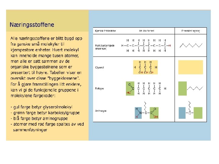 Arbeidsoppgaver • • • Hvilke næringsstoffer har vi? Sett strek under dem som gir oss energi. De store molekylene i næringsstoffene dannes ved at de små molekylene kobles sammen. Hvordan skjer dette? Karbohydrater består av grunnstoffene H, C, og O. Disse deles inn i 3 ulike grupper, hva kalles disse gruppene? Karbohydrater dannes under fotosyntesen, beskriv fotosyntesen med ord. Hva er det som er karbohydrater her da? Hvordan er monosakkarider, disakkarider og polysakkarider bygget opp? Gi et eksempel på hver av dem. Hva er forskjell på raske og langsomme karbohydrater? Hvordan er fettstoffer bygget opp? Er det forskjell på plantefett og dyrefett? Hvordan er proteiner bygget opp, og hvordan binder de seg sammen? Gi eksempler på hvorfor mineraler og vitaminer er viktige for kroppen vår?