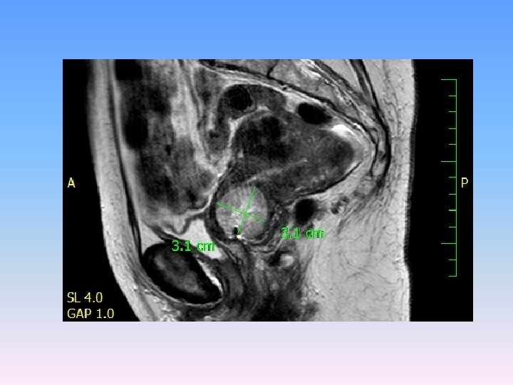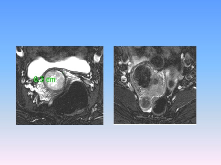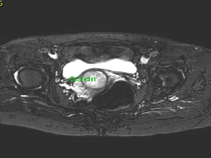 MRI V oblasti cervixu expanzivní útvar 3 cm v průměru s odlišným signálem oproti okolní děloze a vlastním myomům, expanze má vyšší obsah vody. Zaujímá celý vnitřní prostor cervixu, podél expanze zůstává tenký lem tkáně šíře 3 mm. Nikde nepřechází expanze z cervixu na okolní struktury.
