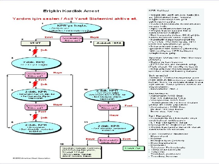 Kardiyak Arrest Ritim kontrolü ŞOKLANIR VF/ n. VT 1 şok 150 -200 J bifazik 360 J monofazik KPR 30: 2 2 dk KPR sırasında • Elektrotların kontrolü • Hava/iv yolu aç, O 2 ver • Havayolu açıklığı sağlanırken masaja ara verme • 3 -5 dk da bir adrenalin • VF/n. VT de amiodaron ŞOKLANMAZ NEA, ASİSTOL KPR 30: 2 2 dk Ritim kontrolü • KPR sırasında hızlı ve güçlü bas (100/dak) • Göğüs kafesinin tamamen geri dönmesine izin ver • 30 kompresyon: 2 soluk, 5 tur = 2 dakika • Hasta entübe edildikten sonra solunum sayısı 8 -10/dak • Her 2 dakikada masaj yapan değişsin