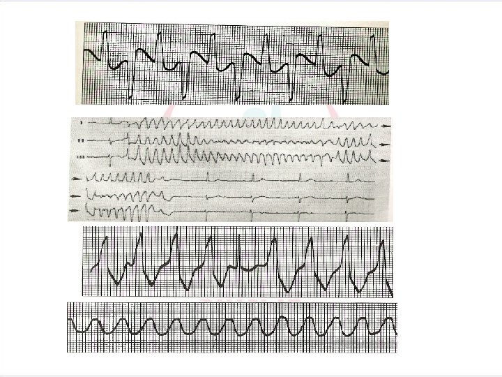 Diğer Ayırıcı Özellikler • Fibrilasyon dalgaları: Dalga yüksekliği 0. 2 m. V’nin üstünde ise kaba dalgalı , 0. 2 m. V’nin altında ise ince dalgalı ventriküler fibrilasyondan söz edilir. Kaba dalgalı ventriküler fibrilasyon, defibrilasyona daha iyi yanıt verebilir. • Ventriküler fibrilasyon seyrinde bilinç kaybı, nöbetler, apne görülebilir Arteriyel kan basınca, nabız alınamaz, kalp sesleri yoktur. • Ventriküler Flatter: Ventriküllerin herhangi bir ya da birkaç yerinden kaynaklanan, kısa sürede VF’ye dönüşen VT ile VF arasında bir geçiş ritmidir. Ventriküler hız dakikada 150 -300/dk genellikle 200/dk arasındadır. P, QRS, T dalgaları ayıdedilemez. Ortaya çıkan dalgaların alt ve üst uçlarının yuvarlak olması en belirgin özelliğidir. Klinik olarak ventriküler fibrilasyondan farklı bir anlam taşımadığı için ventriküler fibrilasyon gibi tedavi edilir.