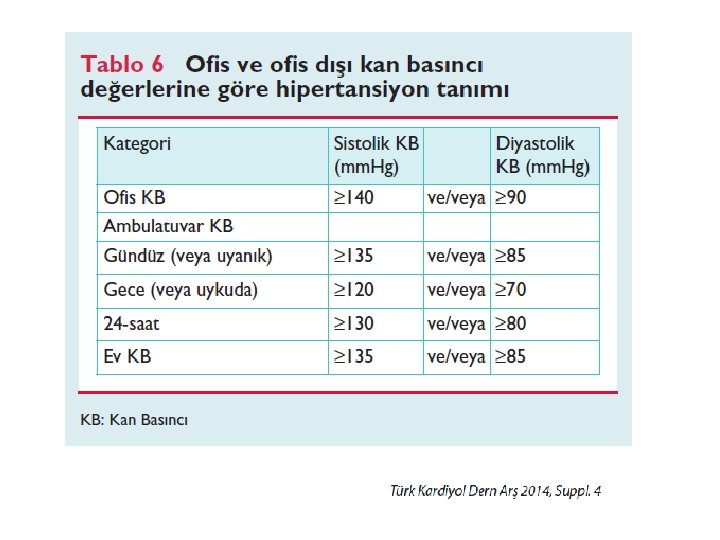 Tanı • Birden fazla vizitte (grade 3 ve yüksek riskli hastalar hariç), 1 -2 dk aralıklarla en az 3 ölçümde (son 2 ölçümün ortalaması) SKB) ≥ 140 mm. Hg ve/veya diyastolik kan basınıcının (DKB) ≥ 90 mm. Hg olmasıdır VEYA, • AKBM veya evde kan basıncı ölçümü ile tanı konulur.
