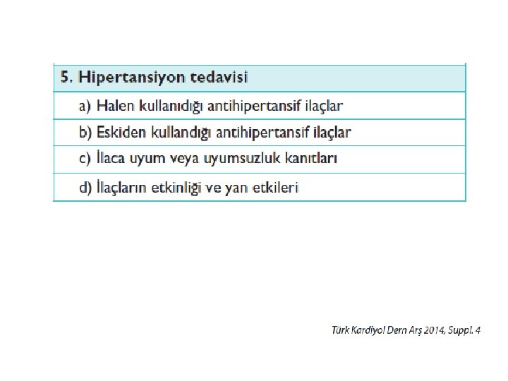 Dirençli hipertansiyon • Tüm hipertansif nüfusunun %5’i ila %30’u arasında • Yüksek KV ve renal olay riskiyle ilişkilidir. • Obezite veya fazla kilo alımı • Aşırı alkol tüketimi • Yüksek sodyum alımı • Vazopresör veya sodyum tutucu maddelerin kronik alımı • Tıkayıcı uyku apnesi • Hipertansiyonun saptanmamış ikincil biçimleri