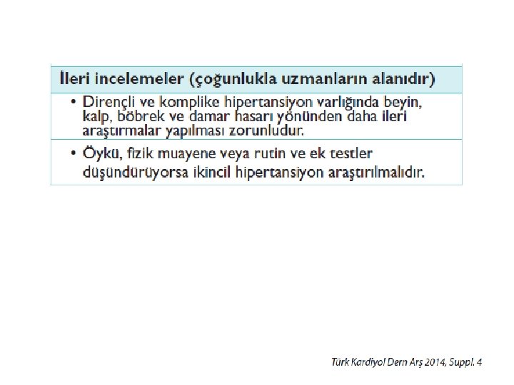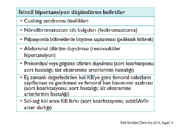İkincil hipertansiyon biçimlerinin araştırılması • Genç yaşta başlayan hipertansiyon • KB’de ciddi bir yükselme • Ani başlayan veya kötüleşen hipertansiyon • İlaç tedavisine yetersiz KB yanıtı • Hipertansiyon süresine orantılı olmayan organ hasarı • Hipertansiyonlu hastaların %10’u