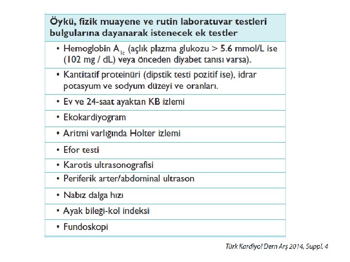 Tanısal değerlendirme 1. Hipertansiyon tanısı doğrulanmalı 2. İkincil hipertansiyon nedenleri tespit edilmeli 3. KV risk, organ hasarı ve eşlik eden klinik durumları araştırmalıdır • • • Kan basıncı ölçümü Tıbbi öykü alımı Fizik muayene Laboratuvar incelemeleri İleri tanısal testler