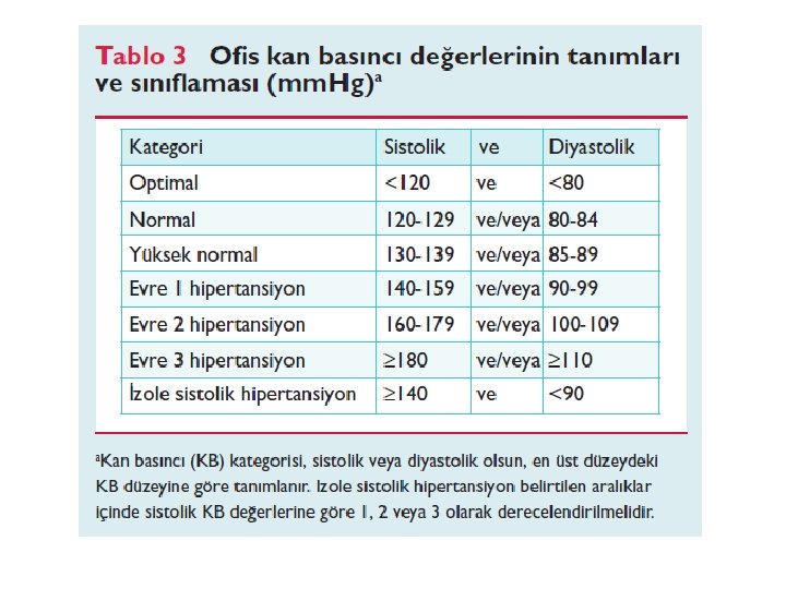 Tanım ve sınıflama • Sistolik kan basınıcının (SKB) ≥ 140 mm. Hg ve/veya diyastolik kan basınıcının (DKB) ≥ 90 mm. Hg olmasıdır. • Randomize kontrollü çalışmalarda bu değerlerin altına düşürmenin yararlı olduğu gösterilmiştir.