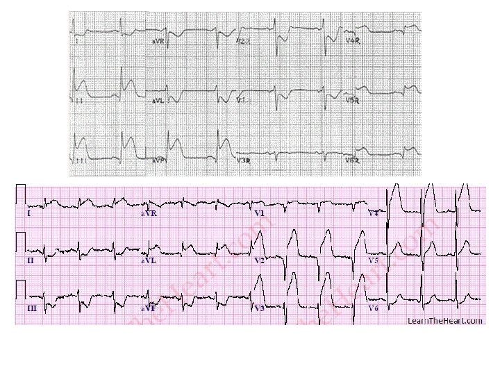 STEMI – Tanısal testler • Troponin, CKM-MB ve miyoglobin, • EKG’de 2 veya daha fazla takip eden derivasyonlarda 1 mm veya daha fazla ST segment elevasyonu olması, – Genelde resiprokal ST segment depresyonu – V 2 -V 3 için erkeklerde 2 mm, kadınlarda 1, 5 mm elevasyon • AKS kliniği olan hastada yeni gelişen sol dal bloğu geniş anterior duvar MI bulgusudur, • EKO’da segmenter duvar hareket bozukluğu görülür,