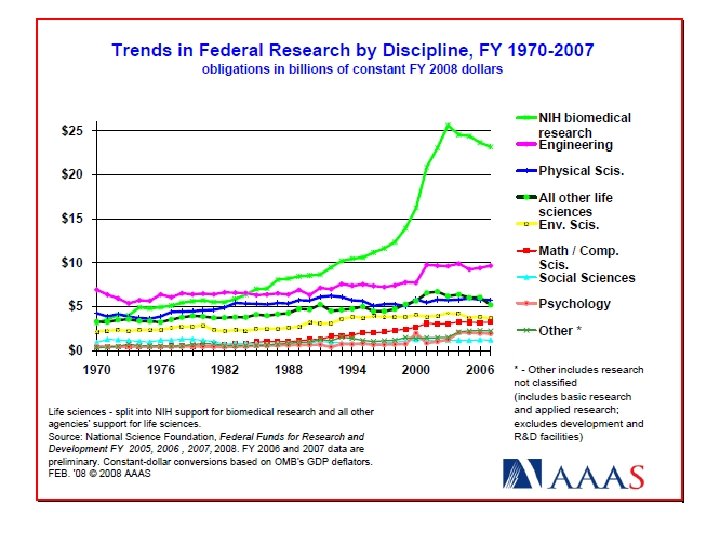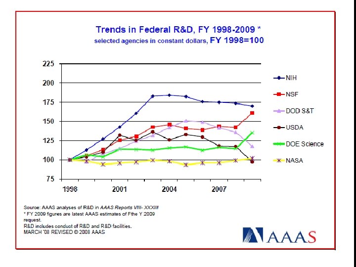 Federal Support for research • In inflation-adjusted dollars, federal funding for the physical sciences has been flat for several decades • This comes at a time when other nations are increasing their public investments in R&D • The America Competes Act will hopefully represent a reversal of this trend.