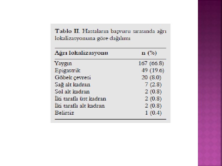 KARIN AĞRISI İLE GELEN HASTALARIN DEĞERLENDİRİLMESİ Aralıklı zamanlarda ortaya çıkan ve bir süre sonra kendiliğinden kaybolan ağrılarda ise; paraziter enfestasyonları, kabızlık, üriner enfeksiyon, orak hücreli anemi, FMF, akut intermitan porfiria, kistik fibrozis ve inflamatuar barsak hastalıkları