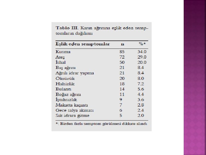 KARIN AĞRISI İLE GELEN HASTALARIN DEĞERLENDİRİLMESİ Ağrıdan bir süre sonra olan kusmada ise intestinal obstrüksiyon ve akut apandisit, Ağrı ile birlikte kusma, gaz- gaita çıkaramama durumunda ise ileus, Adet gören bir kız çocuğunda karın ağrısının olması; mittelschmerzi, over kisti torsiyonu yada rüptürünü ,