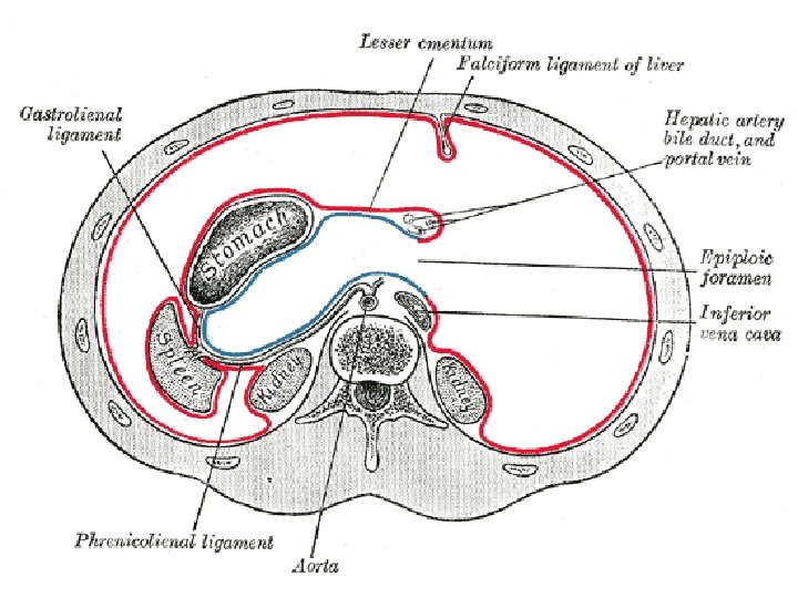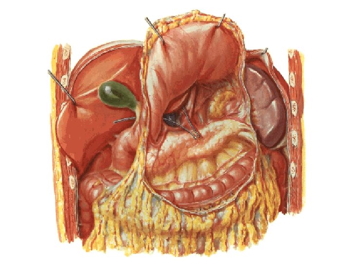 Peritoneal ligamentler Omentum minus ile ilgili: Lig. hepatogastricum Lig. hepatoduodenale Omentum majus ile ilgili : Lig. gastrophrenicum Lig gastrosplenicum Lig. gastrocolicum Lig. phrenicocolicum Lig. splenorenale Kadınlarda Lig. latum uteri Lig. suspensorium ovarii