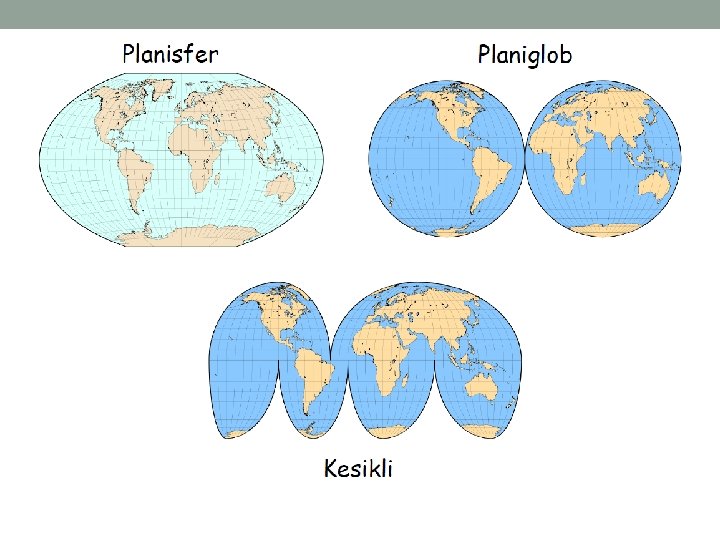 • Yer kürenin tamamının gösterilmesi üç şekilde olur: • Planiglob Gösterim • Planisfer Gösterim • Kesikli (Parçalı) Gösterim