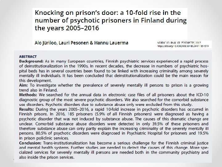 Kas vangimaja on haigemaja? In recent years, prisons and jails have become de facto psychiatric hospitals, responsible for the care and treatment of individuals with serious mental illness Alo Jüriloo psühhiaater ja kohtupsühhiaater ülemarst alo. juriloo@vth. fi Tallinn 23. 11. 2017
