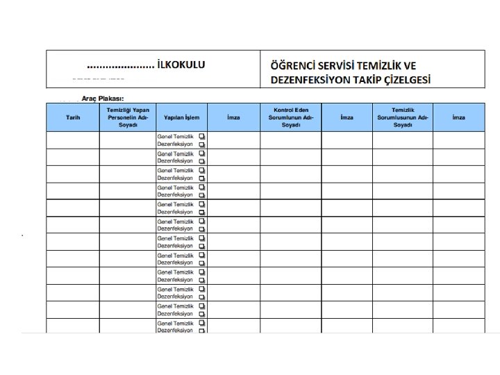 • Şoför, rehber personel vb. Servis görevlilerinin genel hijyen kuralları ve salgın durumlarına özgü önlemlere (maske kullanımı, sosyal mesafe, el hijyeni, hapşırık adabı) gibi uymalarının sağlanması ve Temizlik ve Dezenfeksiyon işlemlerinin yerine getirilmesi amacıyla hazırlanmıştır.