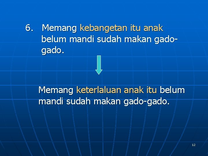 6. Memang kebangetan itu anak belum mandi sudah makan gado- gado. Memang keterlaluan anak itu belum mandi sudah makan gado-gado. 12
