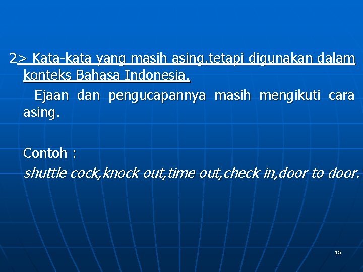 2> Kata-kata yang masih asing, tetapi digunakan dalam konteks Bahasa Indonesia. Ejaan dan pengucapannya masih mengikuti cara asing. Contoh : shuttle cock, knock out, time out, check in, door to door. 15
