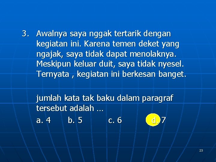 3. Awalnya saya nggak tertarik dengan kegiatan ini. Karena temen deket yang ngajak, saya tidak dapat menolaknya. Meskipun keluar duit, saya tidak nyesel. Ternyata , kegiatan ini berkesan banget. jumlah kata tak baku dalam paragraf tersebut adalah … a. 4 b. 5 c. 6 d. 7 23