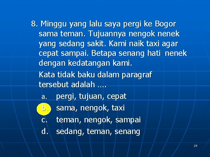 8. Minggu yang lalu saya pergi ke Bogor sama teman. Tujuannya nengok nenek yang sedang sakit. Kami naik taxi agar cepat sampai. Betapa senang hati nenek dengan kedatangan kami. Kata tidak baku dalam paragraf tersebut adalah …. a. pergi, tujuan, cepat b. sama, nengok, taxi c. teman, nengok, sampai d. sedang, teman, senang 29