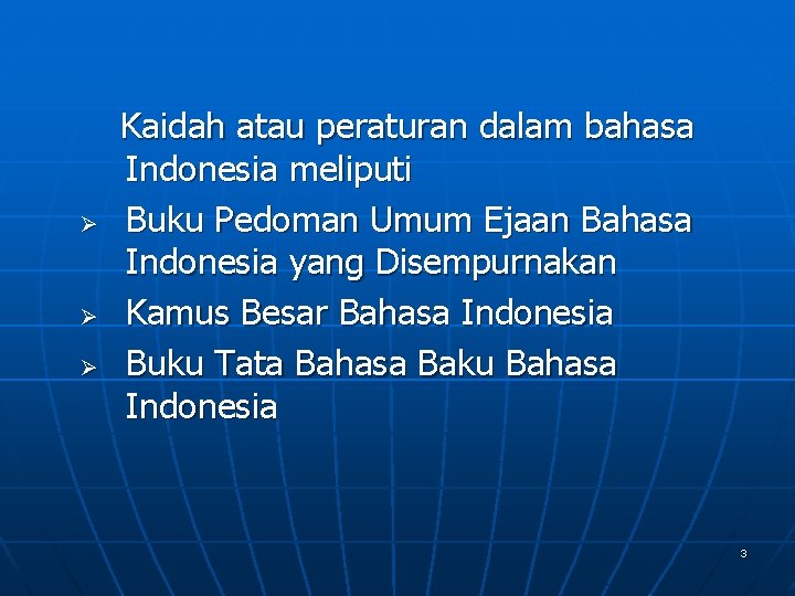 Ø Ø Ø Kaidah atau peraturan dalam bahasa Indonesia meliputi Buku Pedoman Umum Ejaan Bahasa Indonesia yang Disempurnakan Kamus Besar Bahasa Indonesia Buku Tata Bahasa Baku Bahasa Indonesia 3