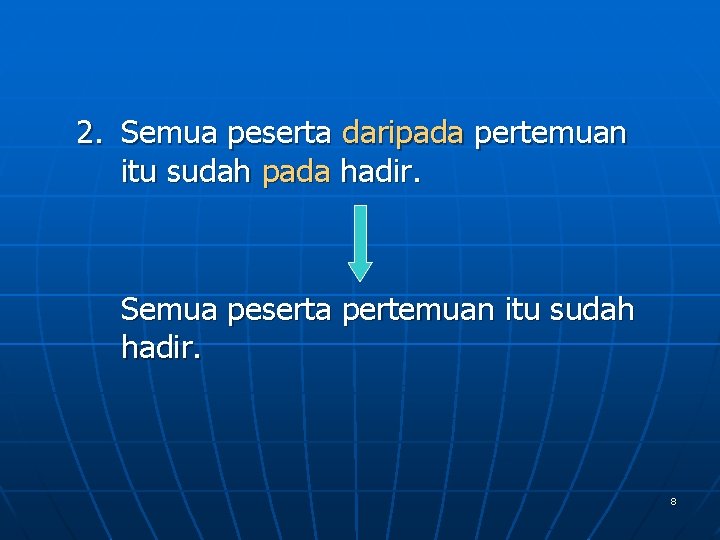 2. Semua peserta daripada pertemuan itu sudah pada hadir. Semua peserta pertemuan itu sudah hadir. 8