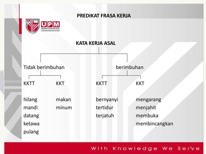 KKT kebanyakan kata kerjanya berimbuhan me. N (me-, men-, mem-, menge-, meny, memper-)多数 KKT的动词会有imbuhan me. N KKTT kebanyakan kata kerjanya berimbuhan ber, ber…kan dan ter 多数KKTT的动词会有 imbuhan ber , ber…kan, ter