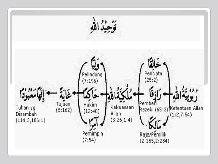 Pembagian Tauhid Macam-macam tauhid ada empat yaitu : 1. Tauhid Uluhiyah (Rububiyah) yaitu meyakini bahwa allah yang menciptakan mahluk 2. Tauhid Ubudiyah yaitu allah itu satu-satunya zatyang harus di ibadahi 3. Tauhid Isti’anah yaitu allah satu-satunya zat yang patut dimintai pertolongan 4. Tauhid Asma Washufat yaitu allah maha segalanya, sifat dalam asmaul husna.