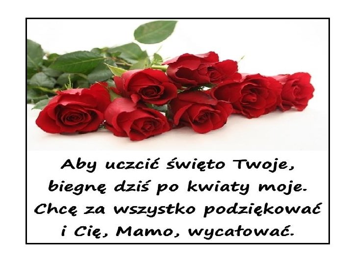A teraz mamo kochana posłuchaj… • „Ważne słowo” Jest takie słowo, słowo jedno, • „BUKIET” przy którym inne W małym bukiecie słowa bledną. majowe kwiatki • Słowo - jak słonce jaśniejące, zakwitły wczoraj na Święto co wszystkie inne słowa gasi. Matki. • Słowo z muzyki i uśmiechu, z zapachu kwiatów i nut ptasich. Majowe kwiatki • Słowo, co nigdy nie zawodzi, wstążką związane. wierne i czułe do ostatka. Niech sto lat żyją mamy kochane! • Najbliższe sercu, najpiękniejsze. jedno, jedyne słowo: • Matka!