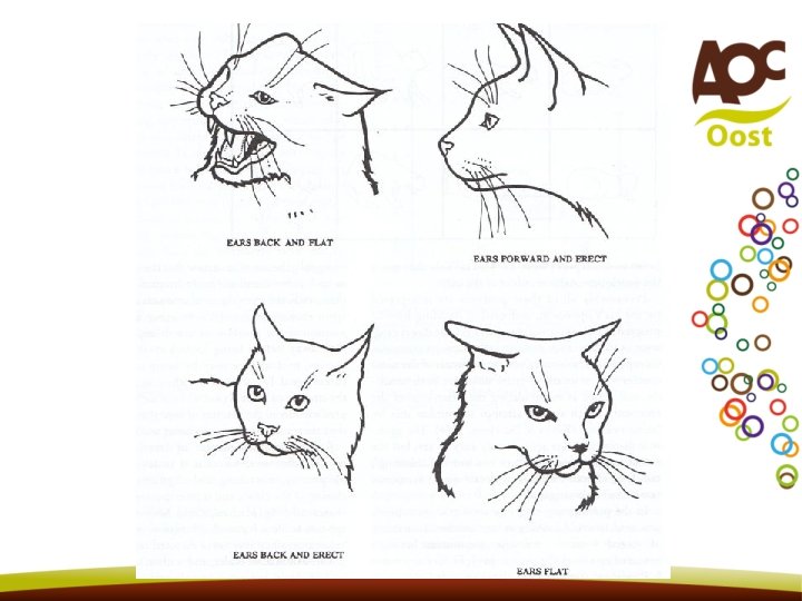 Stem • Er zijn veel verschillende stemgeluiden bij katten te horen (ongeveer 16). • Onderling maken katten weinig geluid, tenzij er gedreigd en gevochten wordt. • Mekkeren bij het zien van een prooi • Vaak: hoe hoger het geluid hoe angstiger de kat is. • Praat tegen je kat op hoge, zachte en melodieuze toon (vriendelijk)