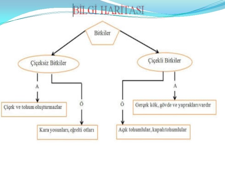 Bilgi haritası nedir? �Bilgi haritaları, bilginin kullanılması için haritalandırılmasına, organizasyon şemaları yapılmasına, karar ağaçlarının çizilerek gözden geçirilmesine yaramaktadır. �Bir ülkeye ait bölgeler haritası, bir kıtaya ait ülkeler haritası da bilgi haritası olup, bunlar ‘örümcek harita’ olarak adlandırılmaktadır. �Öğrenmeyi kolaylaştıran haritalar; zihin, kavram ve bilgi haritalarıyla sınırlı değildir. Kelime haritaları, iş akış şemaları gibi çok çeşitli haritalar söz konusudur.