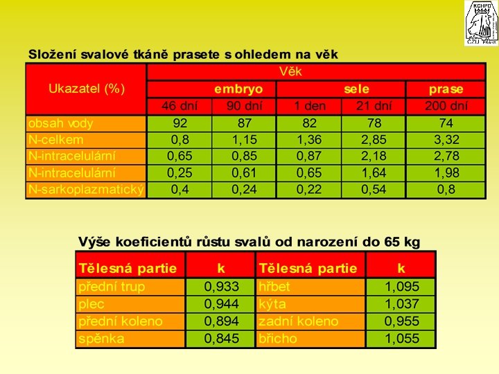 Vliv věku a hmotnosti se zintenzivňuje cca v 90 kg živé hmotnosti kdy prasata již začínají mít: - nižší intenzitu relativního růstu svalstva, - počátek stoupající tvorby tuku, - vykazují cca = 85% celkového obsahu svalstva, = 66% tuku ve vztahu k 115 kg živé hmotnosti, - koeficienty růstu = masa 1, 04 s kraniokaudálním a distoproximálním gradientem odvislým více či méně od plemen = kostí 0, 75, = tuku 1, 20.