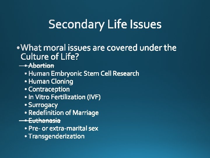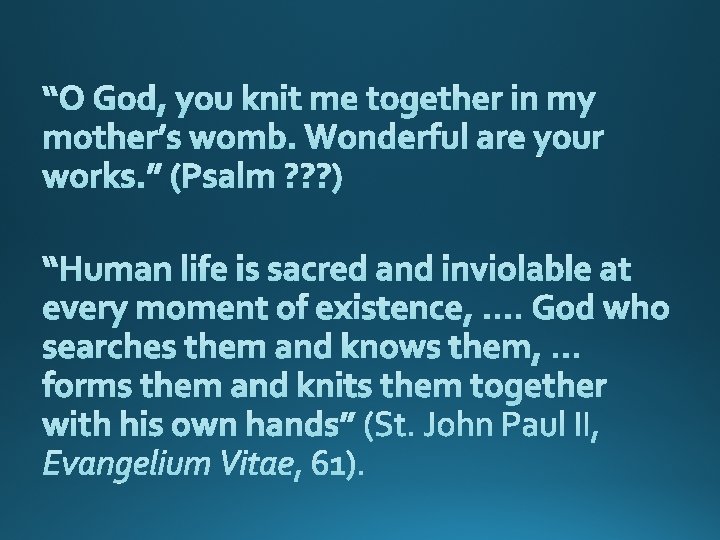 Pope Francis in the Holy Land said: “Every child needs to be accepted and protected…children need to be welcomed and defended, from the moment of their conception. ” Contraception Human Cloning Surrogacy Human Embryonic Stem Cell Research Abortion Redefinition of Marriage Attack on the dignity of the human person and the family Euthanasia “As the family goes, so goes the nation and so goes the whole world in which we live. ” Pope Saint John Paul II