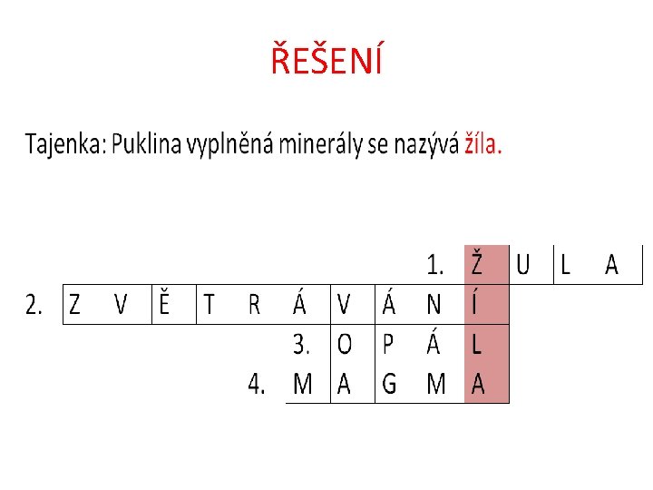 1. hornina tvořící Jizerské hory 2. působení vody a vzduchu na minerály 3. amorfní nerost 4. tavenina nerostů Tajenka: Puklina vyplněná minerály se nazývá……. .