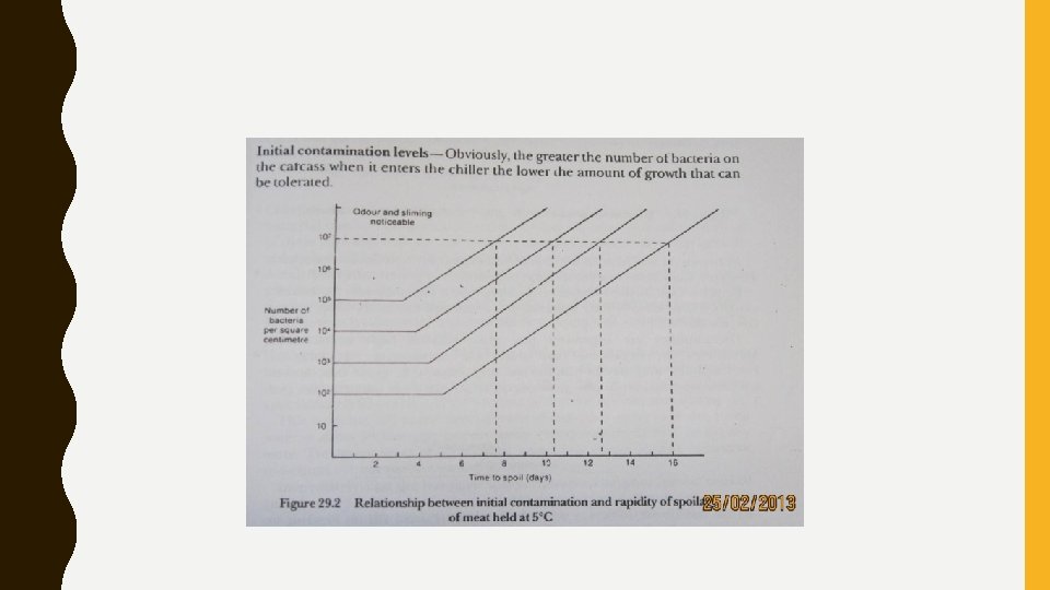• Mild spoilage sebabkan sourness • Severe spoilage disebut putrefaction • Jumlah bakteri pada keadaan off-flavour adalah 107 per cm 2 Dressed carcass yang higienis 103 per cm 2