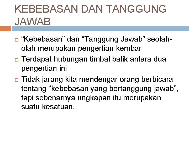 KEBEBASAN DAN TANGGUNG JAWAB “Kebebasan” dan “Tanggung Jawab” seolah merupakan pengertian kembar Terdapat hubungan timbal balik antara dua pengertian ini Tidak jarang kita mendengar orang berbicara tentang “kebebasan yang bertanggung jawab”, tapi sebenarnya ungkapan itu merupakan suatu kesatuan.