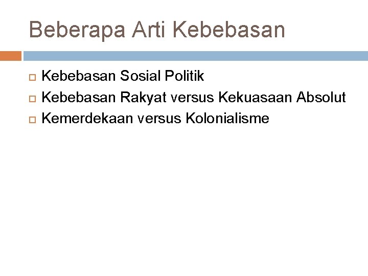 Beberapa Arti Kebebasan Sosial Politik Kebebasan Rakyat versus Kekuasaan Absolut Kemerdekaan versus Kolonialisme