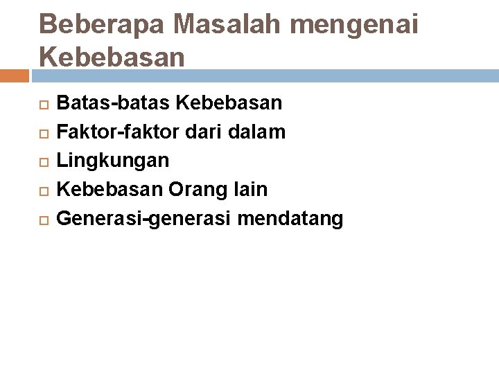Beberapa Masalah mengenai Kebebasan Batas-batas Kebebasan Faktor-faktor dari dalam Lingkungan Kebebasan Orang lain Generasi-generasi mendatang