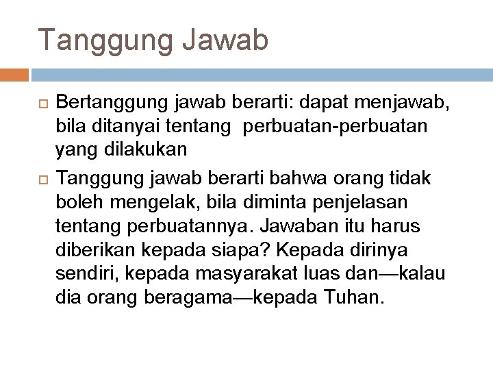 Tanggung Jawab Bertanggung jawab berarti: dapat menjawab, bila ditanyai tentang perbuatan-perbuatan yang dilakukan Tanggung jawab berarti bahwa orang tidak boleh mengelak, bila diminta penjelasan tentang perbuatannya. Jawaban itu harus diberikan kepada siapa? Kepada dirinya sendiri, kepada masyarakat luas dan—kalau dia orang beragama—kepada Tuhan.