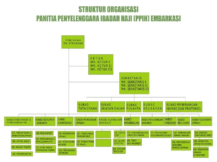 STRUKTUR ORGANISASI PANITIA PENYELENGGARA IBADAH HAJI (PPIH) PUSAT PENGARAH Penanggung Jawab Ketua WK. Ketua 1 WK. Ketua 2 WK. Ketua 3 SEKSI TATA USAHA BID. PENGENDALIAN OPERASIONAL SEKRETARIS WK. SEKRETARIS SEKSI URUSAN DALAM BID. HUMAS. DAN PENERANGAN SEKSI KEUANGAN SEKSI PERLENGKAPAN DAN TEKNIK BID. KESEHATAN DAN KEAMANAN SEKSI MONITORING SEKSI PENGUMPULAN DAN PENGELOLAAN DATA SEKSI PELAPORAN DAN EVALUASI SEKSI HUMAS SEKSI KESEHATAN SEKSI MEDIA CENTER HAJI (MCH) SEKSI KEAMANAN SEKSI PENERANGAN