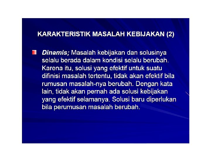 Situasi Masalah/Problematis Situasi yang dianggap sebagai problematis secara sosial, atau situasi yang merupakan masalah sosial yang menuntut pemecahan masalah secara kolektif melalui penerapan suatu kebijakan publik tertentu. Dikatakan problematis jika ada jarak/gab antara keadaan yang diinginkan dengan yang senyatanya. Situasi problematis merupakan situasi umum yang dapat kita peroleh dari koran-koran/hasil penelitian/laporan dinas. Kondisi tersebut dipandang policy maker tidak diinginkan, karena itu perlu dipecahkan, misal : kemiskinan, AIDS, PSK, dll. Situasi problematis ini merupakan hasil dari metode pengenalan masalah. Perumus kebijakan atau analis kebijakan perlu mengenali apa sifat atau hakekat dari suatu masalah kebijakan